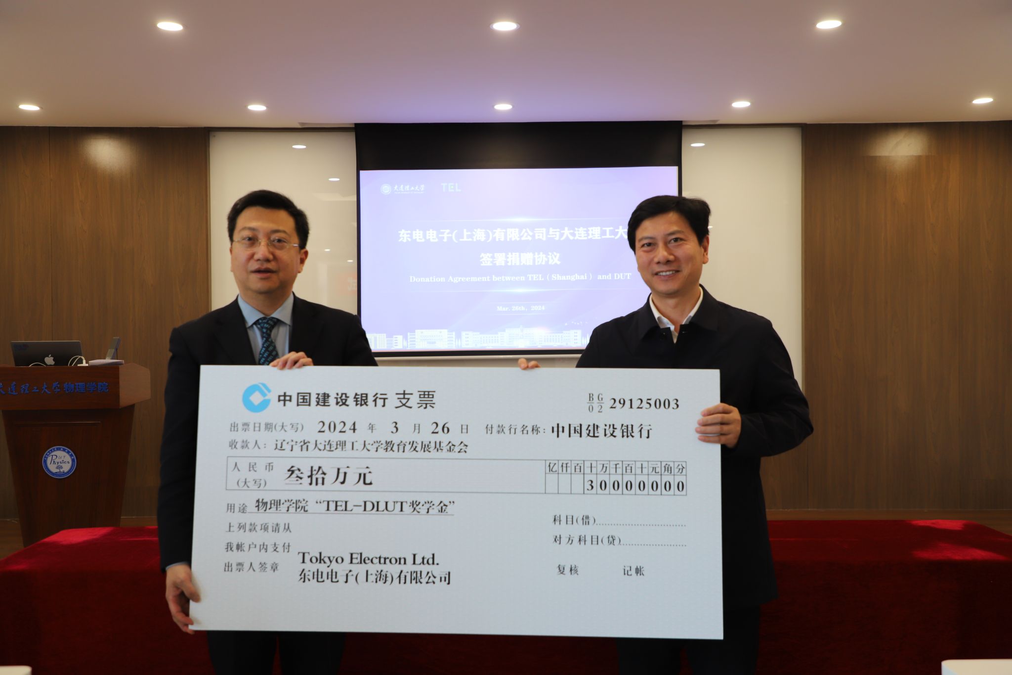 东电电子(上海)有限公司钱立群总监与大连理工大学国内合作与联络处处长杨克旭签署捐赠协议。