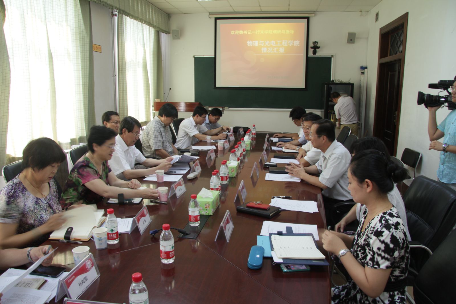 8月8日上午,学校党委书记魏小鹏在物理与光电工程学院系楼425会议室,调研宝威体育平台工作。学校办公室主任宋丹、科研院院长宋永臣、教务处处长朱泓、研究生院副院长郭驰、发展规划处处长姚化成、组织部副部长孙刘劼、人事处副处长韩敏、校办秘书科科长苏克治陪同走访。学院党政领导班子成员赵明山、刘金远、周玲、丁洪斌、常亮、杨木出席会议。