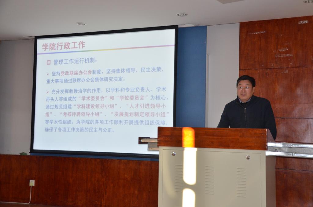 学院党委书记刘金远同志代表领导班子进行了年度行政与党委工作总结。2015年,学院紧紧围绕“一流学科”方案的制定和论证,不断凝练和明晰学院发展思路与目标定位,坚持以教学与人才培养、学科与队伍建设、科研与平台建设为核心,促进学院各项事业全面协调发展。围绕教学与人才培养、教师队伍建设、科研与平台建设、党员发展、组织建设、党员培训与干部监督、工会与群团组织建设、学院宣传与文化建设、保密等工作,刘金远同志介绍了学院工作开展情况与工作业绩。同时,总结了目前学院改革发展的重点与难点,2016年,学院将学校做好学院党政班子的换届工作,确保学院各项工作的有序推进。