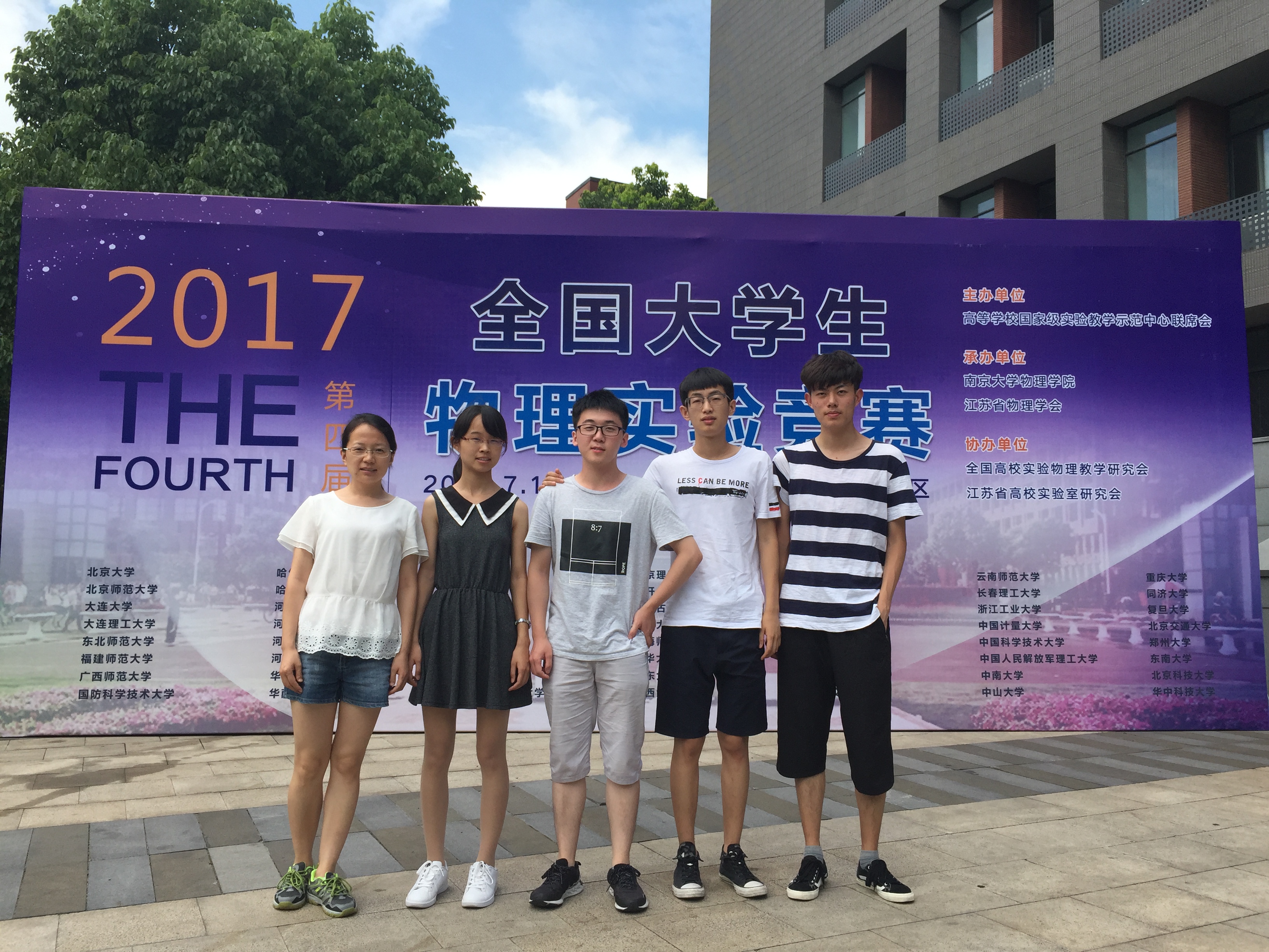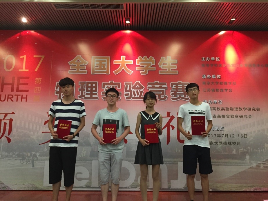 2017年7月12日至15日,第四届全国大学生物理实验竞赛在南京大学仙林校区举行。来自北京大学、清华大学、中国科学技术大学、上海交通大学、复旦大学、南开大学等全国56所高校共216名学生参加此次实验竞赛。竞赛项目分设基础性实验和综合研究性实验两类。我校代表队范本澍同学获得基础性实验一等奖,郭泽安同学获得基础性实验二等奖,廖珺豪同学、张文笛同学组合获得综合研究性实验入围奖。