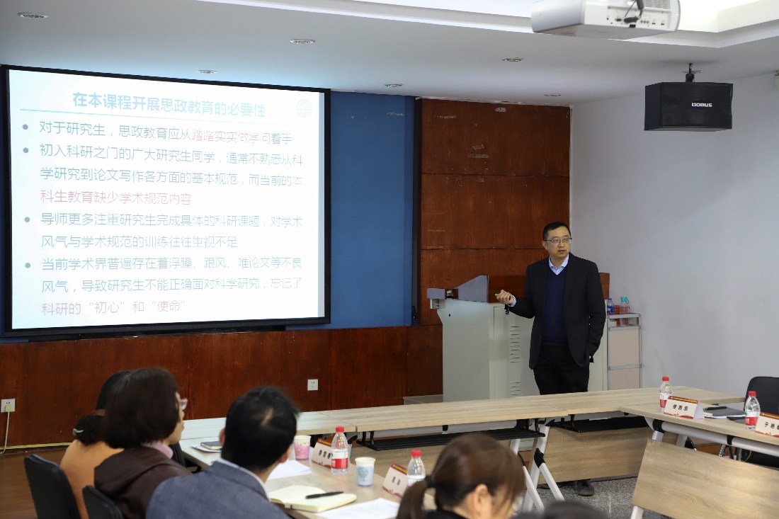 宝威体育平台院长赵纪军在会上做《“学术规范与写作”校级课程思政示范课经验介绍》报告,结合“弘扬科学精神、提升学术品味、普及学术规范、恪守学术道德”四个课程核心理念,详细讲解了该门课程的主要内容与目标效果。
