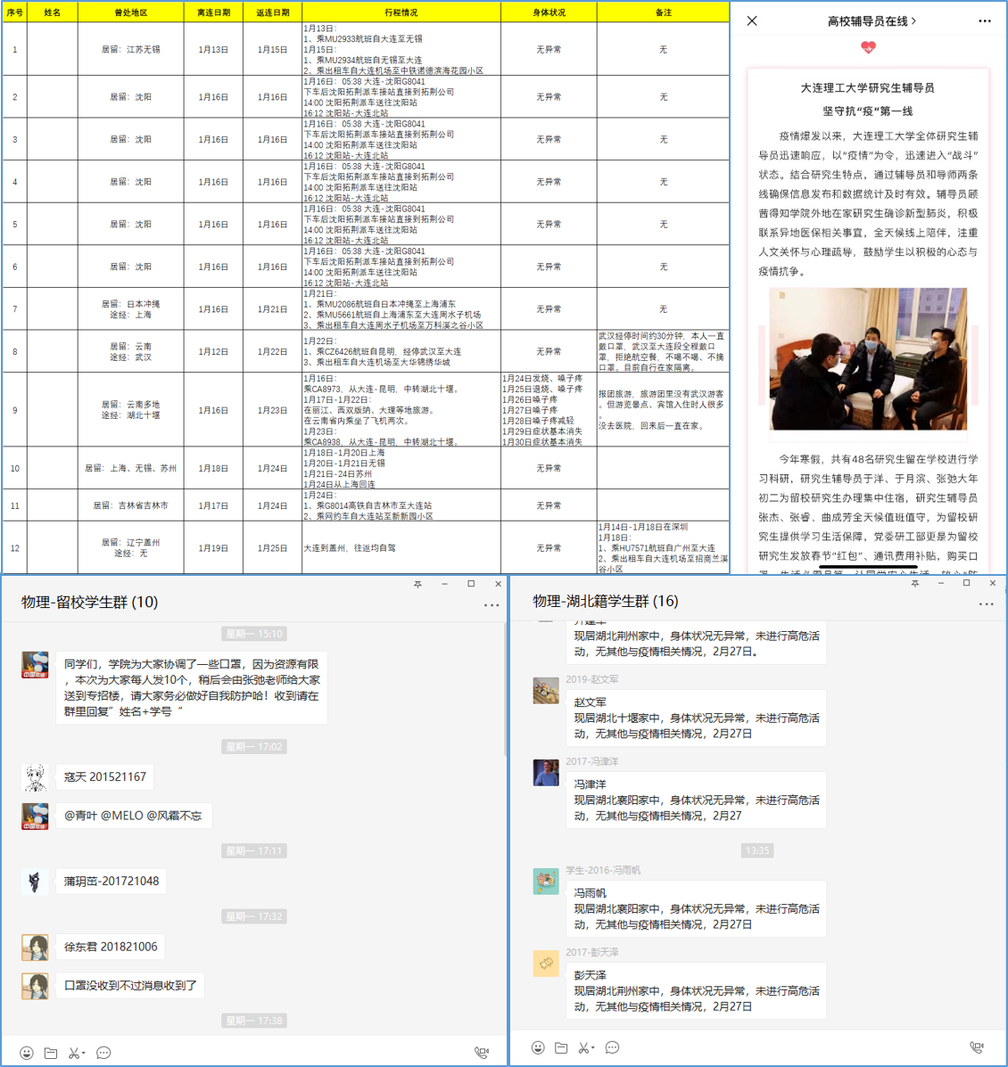 学院党委办公室、综合办公室、学生工作(研究生工作)办公室的专职行政人员在疫情防控中积极联动,确保面向不同群体的各项管理统计精准、到位、全覆盖。学院按照最大口径进行教师管理,包括在职博士后、外籍教师、兼职教工、工勤人员等特殊群体均纳入统计;通过建立“学院-学科点负责人-研究生导师-研究生”“学院-辅导员-班长-寝室长”两套四级联动机制,确保各项通知及时下达;学院党委带领各研究生党支部委员,与学院81名离退休教师全部建立直接联系,掌握精确离连返连信息;学办为留校学生、湖北生源学生建立专用微信群,由辅导员直接听取每日健康报告;研究生辅导员张弛在大年初二来校,为留校研究生办理集中住宿手续。
