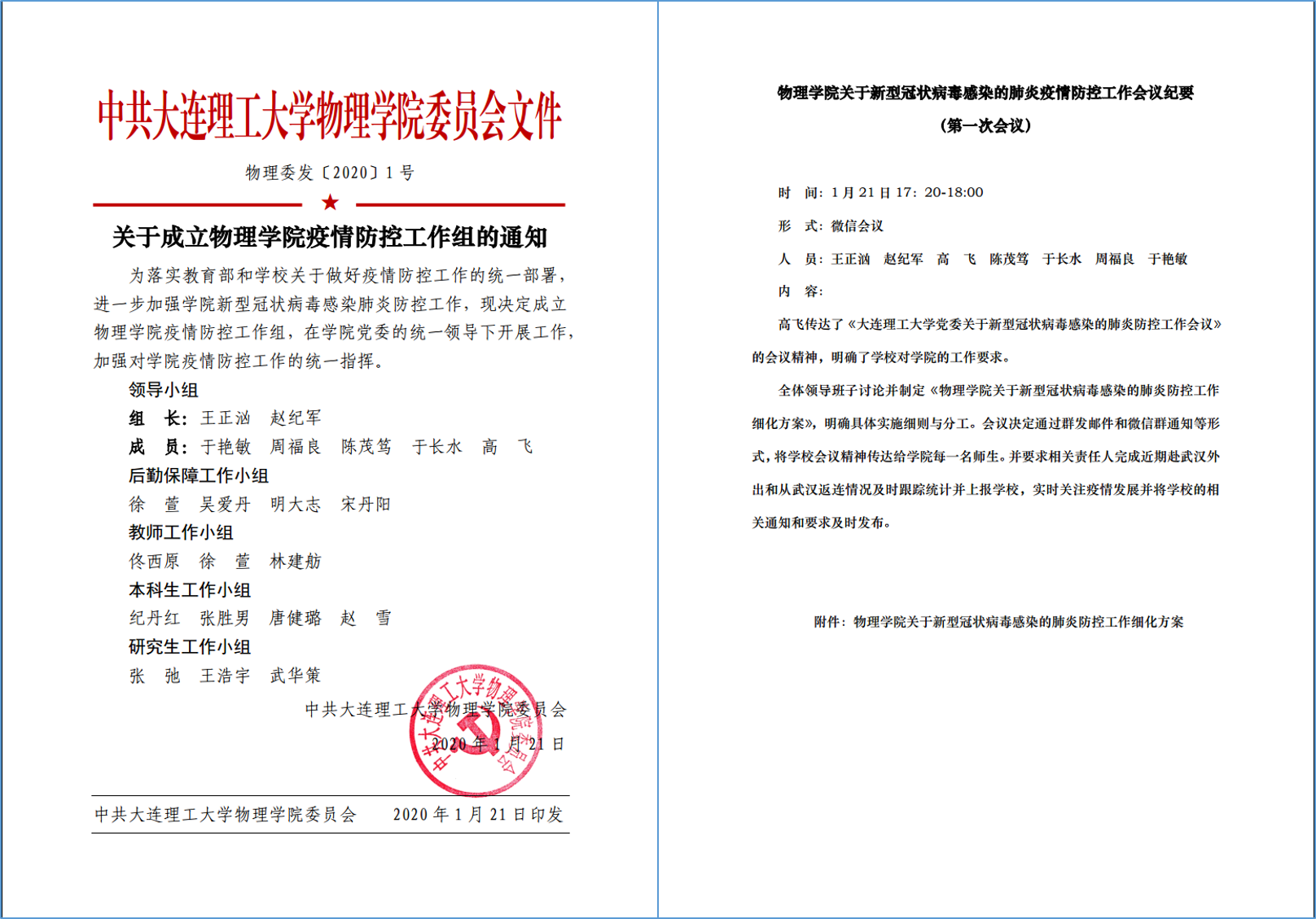 学校疫情防控工作伊始,宝威体育平台迅速成立了以党委书记王正汹、院长赵纪军为双组长的学院疫情防控工作组,明确该项工作由学院党委负责,领导班子全体成员参与并承担不同分工。学院党委参考 “一岗双责”要求,确定了领导班子各成员在疫情防控工作中的责任所在,相应按照党、政、研、本的划分成立了4个工作小组,将疫情防控工作的上级部署与院内事务进行了清晰的分配。