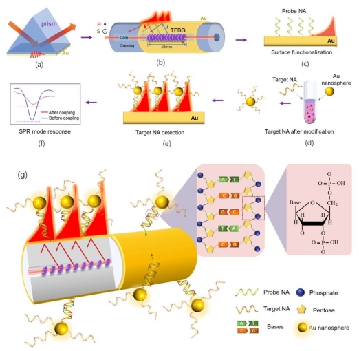 宝威体育平台先进光学与光纤传感技术团队的彭伟教授和张扬副教授与中国计量大学合作,联合通信作者身份在最新一期Biosensors and Bioelectronics(影响因子IF=12.6)上发表论文,介绍了一种基于倾斜光纤布拉格光栅(TFBG)的超灵敏核酸检测系统。该传感系统基于一种无标签光纤表面等离子共振(SPR)的生物传感器,相较于公认的Kretschmann-Raether棱镜等体棱镜结构,具备更低成本、小型化及临床快速检测应用(POCT)的优势。在这一传感系统中,TFBG发射的包层模式在光纤包层上的薄金涂层中诱导表面等离子体共振,实现了对NA的超灵敏检测和超低限的检测能力。该技术突破了传统无标记光纤生化NA传感的极限,实现了从aM到pM(10^-18到10^-12M)的大动态检测范围,以及10^-18M最低检测限(LOD),是目前报道的光纤核酸检测传感器中最低的检测极限。