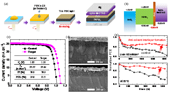 成果简介:这项技术的发展重点是实现高效、稳定的PSCs并探清其物理机制。目前,绝大多数高效稳定的PSCs都是基于多阳离子混合阴离子的组合物,其中甲基铵的热不稳定性和混合卤化物组分的相分离倾向严重限制了PSCs的长期稳定性。近日,博士后王敏焕在该领域取得突破性进展。首次提出了原位反溶剂界面PVK钝化技术,实现了基于完全无铯、无甲基铵和无溴钙钛矿组分(FAPbI3)的太阳电池,稳态效率达19.36%,且光热稳定性大幅提升。该成果将为高性能钙钛矿光电器件的研制和实用化提供理论依据和实验技术指导。以“Stable and Efficient Methylammonium, Cesium, and Bromide-free Perovskite Solar Cells by in-situ interlayer formation”为题,发表在《Advanced Functional Materials》上。论文第一作者为宝威体育平台博士后王敏焕,大连理工大学边继明教授、韩国成均馆大学Jin-Wook Lee教授和美国加州大学洛杉矶分校Yang Yang教授为共同通讯作者。该成果得到国家自然科学基金等项目资助。王敏焕于2020年6月博士毕业于大连理工大学微电子学院,现为边继明教授课题组博士后。博士期间荣获校学术之星、研究生国家奖学金(3次)、辽宁省优秀毕业生等多项奖励,在Advanced Materials, Nano Energy, ACS Applied Materials & Interfaces等材料能源领域国际期刊发表论文近20篇。一直从事钙钛矿光电材料与器件研究,并先后在本领域国际顶级科学家美国加州大学洛杉矶分校YangYang课题组和韩国成均馆大学N.G. Park课题组联合培养。