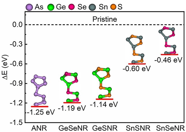 图2.重构的α相单层纳米带对比原始锯齿形边界纳米带的能量变化图(虚线设为零)。