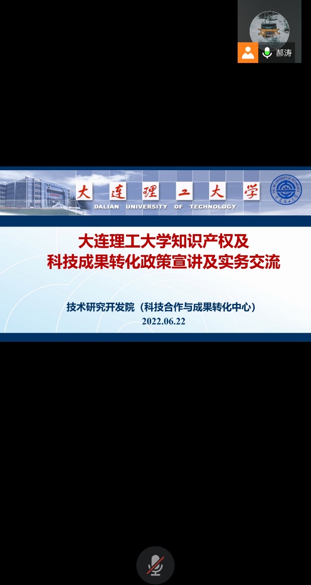 为深入贯彻落实习近平总书记关于知识产权和科技成果转化工作的重要指示,进一步提高广大教师对科技成果转化工作的意识,全面推进国家知识产权示范高校建设,技术研究开发院(科技合作与成果转化中心)带队于6月22日14:00-16:00通过腾讯会议在我院进行知识产权与成果转化政策宣讲。