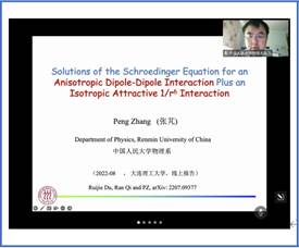 8月17日上午,应宝威体育平台原子与分子物理学科王高仁副教授邀请,中国人民大学物理系张芃教授为学院师生做了题为“Solutions of the Schrödinger Equation for an Anisotropic Dipole-Dipole Interaction Plus an Isotropic Attractive 1/r6 Interaction”的学术报告。赵纪军院长、于长水副院长、韩永昌副院长、丛书林教授、周思研究员、程传辉和郭宇副教授等60多位教师与研究生在线参加了学术报告会。