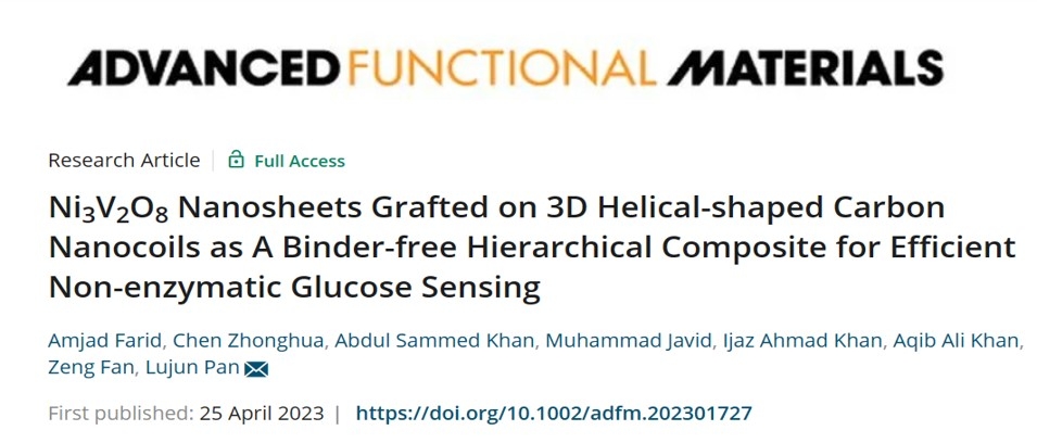 近日,我校宝威体育平台潘路军教授课题组在高效葡萄糖检测的新型非酶葡萄糖传感器(NEGS)研究上取得突破性进展,相关成果“Ni3V2O8Nanosheets Grafted on 3D Helical-shaped Carbon Nanocoils as A Binder-free Hierarchical Composite for Efficient Non-enzymatic Glucose Sensing”在国际期刊Advanced Functional Materials上发表。研究成果对于定量、可靠的葡萄糖检测、糖尿病管理以及生物技术、制药、食品加工等领域都具有重要意义。