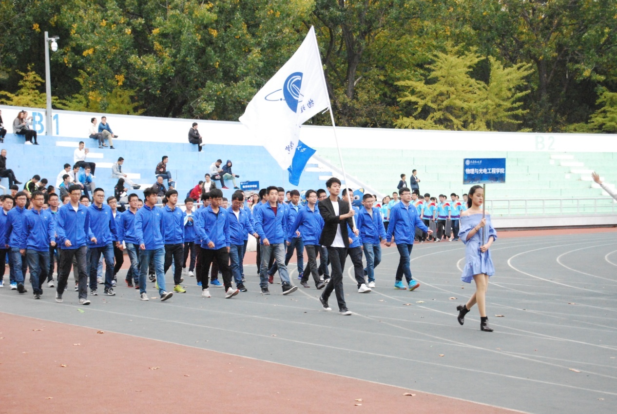 10月16日下午一点,运动会正式开幕。学校以及各学部学院的领导出席开幕式并致辞。由国防生组成的国旗班和花束队率先入场,之后,各学部学院的方阵按顺序先后入场,我院方阵穿着整齐的服装走进体育场,在全校师生面前展示了物理与光电工程学院的风采。