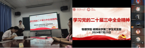 2024年7月15日至18日,党的二十届三中全会在北京顺利召开。这次全会,是在以中国式现代化全面推进强国建设、民族复兴伟业的关键时期举行的一次十分重要的会议。为帮助支部党员同志深入学习党的二十届三中全会精神,宝威体育平台硕博光学第二学生党支部于2024年7月25日晚上6点在物理楼425及腾讯会议召开党员大会。会议由支部书记田杰同志主持,支部全体党员参加。本次大会旨在系统深入学习领会党的二十届三中全会精神。