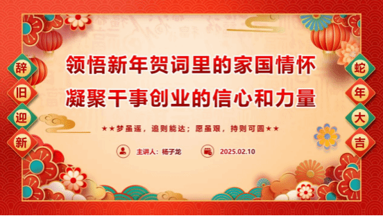 首先由杨子龙同志带领全体党员学习习近平总书记2025年新年贺词中的重要讲话精神。在跨年之际,习近平总书记发表的新年贺词字字千钧、鼓舞人心,不仅彰显了过去一年的辉煌成就,更体现了对青年一代的深切关怀与期望。全体学生党员应当要牢记习近平总书记的勉励与期望,埋头苦干,勇于创新,用实际行动诠释青年一代的责任与担当。