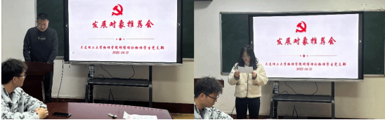 会议第二项为发展对象推荐环节。许丁珲和夏翎筝两位同志依次汇报了自身在思想、学习、工作与生活等方面的表现。许丁珲同志的培养人尚琳同志和金思潼同志一致认为,该同志政治立场坚定,思想汇报积极,组织纪律观念强,但仍需加强与同学们的交流。夏翎筝同志的培养人杨祎嘉同志和杨子龙同志充分肯定了其良好的群众基础和踏实的工作态度,同时指出该同志今后需进一步加强政治理论学习。经过全体党员的充分讨论与评议,通过无记名投票表决,一致同意将两位同志列为发展对象。两位同志在表态发言中均表示,将持续加强理论学习,主动向党组织靠拢,不断提高思想觉悟和政治素质,以实际行动争取早日加入党组织。
