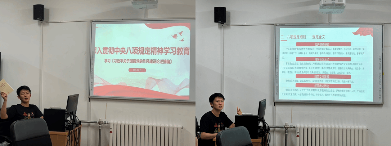 为推动深入贯彻中央八项规定精神学习教育走深走实,切实提升党员的政治素养和理论水平,增强党支部的凝聚力,宝威体育平台硕博等离子体第三学生党支部于2025年5月29日在物理楼422室开展主题党日活动暨深入贯彻中央八项规定精神学习教育主题党课。会议内容主要包括讨论和表决预备党员的转正问题以及学习专题党课。会议由党支部书记高子豪同志主持,党支部全体党员参会。