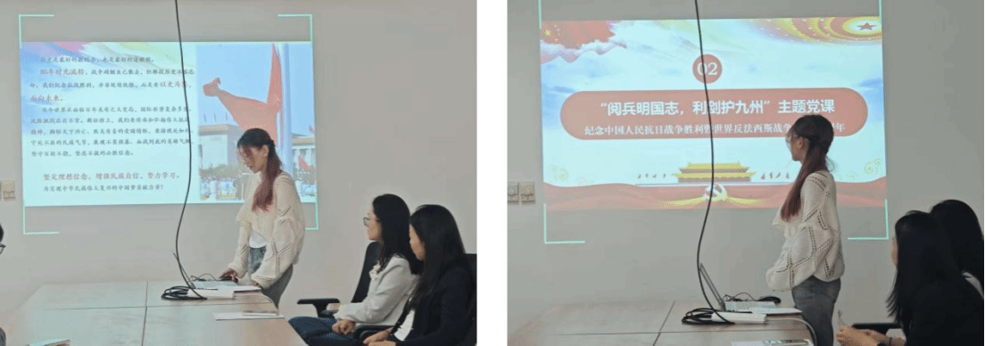 会议第二项,开展“阅兵明国志,利剑护九州”主题党课。郑祉溦同志围绕“国防实力与国家发展的关系”展开深入分析。她指出,强大的国防实力是国家繁荣发展的“安全屏障”,从抗美援朝战争的英勇抗争到新时代国防和军队现代化建设的跨越式发展,我国国防实力的每一次提升,都为国家发展创造了稳定环境。同时,她结合研究生专业特点,鼓励党员们思考“如何将个人所学与国家需求相结合”,举例说明科研工作者在国防科技领域攻坚克难的先进事迹。党员们结合自身经历与学习收获踊跃发言,大家纷纷表示,要从主动学习国防知识、传播国防理念做起,在日常生活中自觉维护国家利益,以实际行动诠释党员的使命担当。