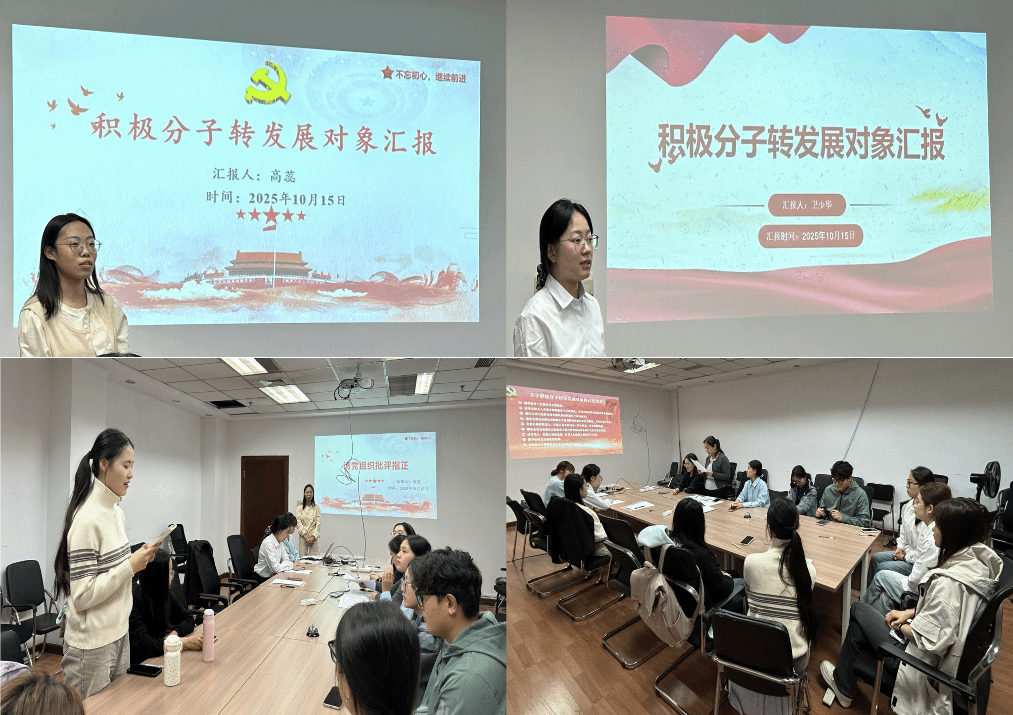 会议严格按照党员发展工作要求和组织程序进行。两名入党积极分子高蕊、卫少华同志依次汇报了自成为入党积极分子以来的思想动态,内容涵盖思想觉悟提升、学习和科研进步以及社会实践参与等方面的成长与体会。随后,培养联系人和团支部书记分别发表了培养意见。经党支部充分讨论并通过参会党员无记名投票表决,高蕊同志和卫少华同志被列为发展对象。随后,两位发展对象郑重表达了自身决心,表示将不断提升政治素养,主动向身边优秀党员同志学习,争取在学习、科研及服务集体中发挥先锋模范作用。