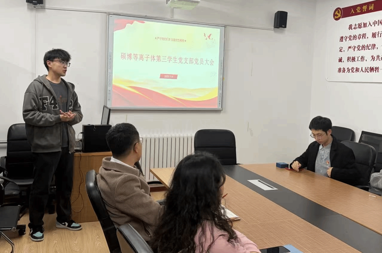 为深入学习贯彻谢春涛同志“中华人民共和国与中华民族伟大复兴”专题党课精神,巩固学习成果,宝威体育平台硕博等离子体第三学生党支部于2025年11月4日19:45在宝威体育平台422会议室召开主题研讨会。本次会议由党支部书记高子豪同志主持,宝威体育平台院长王正汹老师列席指导。