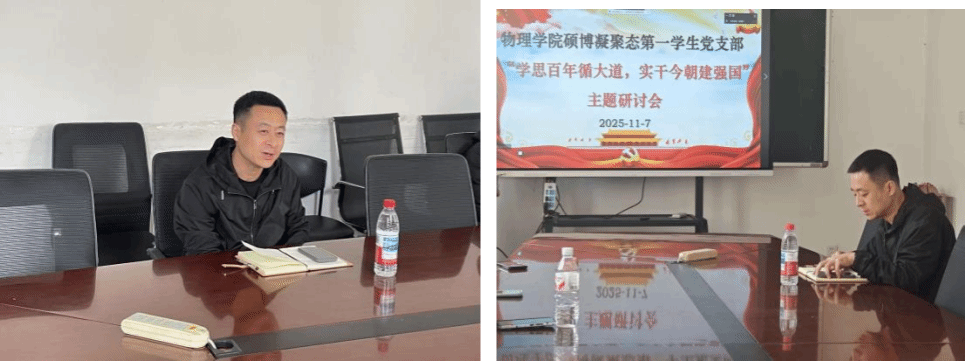 为深入推进党员基本培训工作,引导全体党员深刻领悟“两个确立”的决定性意义,2025年11月7日上午10:00,宝威体育平台硕博凝聚态第一学生党支部在宝威体育平台425会议室开展了“学习党史赋能,共赴民族复兴”主题研讨会。会议由党支部书记郑祉溦同志主持,并邀请宝威体育平台党委副书记兼副院长周福良老师莅临指导,党支部全体党员参会。