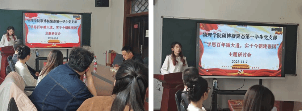 最后,郑祉溦同志对本次主题研讨会进行总结。她强调,希望同志们以本次研讨会为新的起点,把党史的学习不断引向深入,做到学思用贯通、知信行统一。通过本次专题研讨会,全体党员同志深刻认识到党员责任重大:一要持续深化理论学习,把党史的学习与习近平新时代中国特色社会主义思想学习结合起来,不断提升政治理论素养;二要坚持学用结合,把学习成果转化为推动学术研究、服务社会发展的实际行动,在实践中锤炼党性、增长才干;三要积极将物理理论成果、实验创新发现转化为可落地的技术方案或核心器件,以扎实的科研能力与务实的实践态度,为“十五五”规划的顺利推进注入物理学科的青春力量。