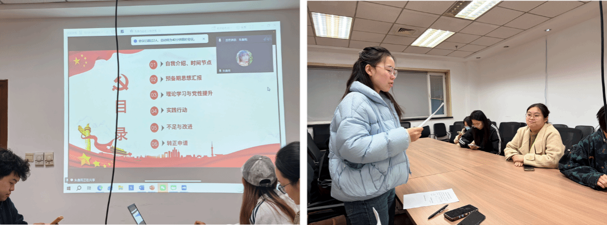会议第二项,对中共预备党员转正的事宜进行讨论与表决。会议严格按照中共预备党员转正工作流程有序推进。会上,党支部书记郑祉溦首先说明本次会议的目的、意义及议程安排,强调了党员发展工作的严肃性和规范性。随后,中共预备党员朱鑫雨同志郑重向党组织提交转正申请,围绕预备期内的思想成长、工作实践、学习提升、作风建设等方面作详细汇报。在党员讨论环节,与会党员围绕朱鑫雨同志在预备期表现展开热烈讨论。大家纷纷发言,既肯定了她在预备期内的明显进步,也本着负责任的态度提出了针对性建议。经无记名投票,一致同意朱鑫雨同志按期转为中共正式党员。朱鑫雨同志表示转正后会持续深化理论学习、补齐能力短板,在更大舞台上发挥党员先锋模范作用。