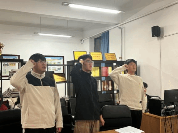 随后,为进一步强化党员的身份意识与责任担当,在党支部委员的带领下,党支部的两名新成员面向鲜红的党旗,庄严举起右拳,宣读入党誓词。铿锵有力的誓言在会场内回荡,彰显着党支部党员对党的无限忠诚与为共产主义奋斗终身的坚定决心。这一刻激励着大家将学习成果转化为强大的内生动力,以更加昂扬的姿态投身于强国建设、民族复兴的伟大实践。
