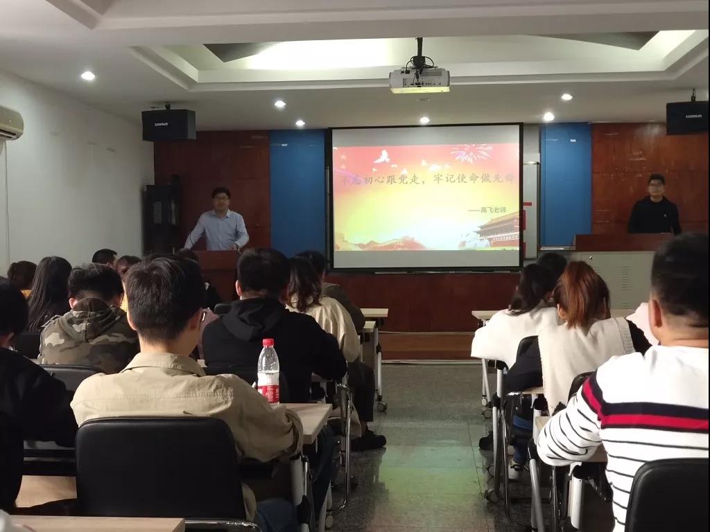 第一部分进行的是主题党课,高飞老师从守初心、担使命、找差距、抓落实四个方面入眼,要求党员同志要明确并深入落实“四个自信”、“四个意识”、“两个维护”,牢记并勇于肩负国家、家庭、个人与学科发展等使命,反思理论与实践、理想与实际的差距,做到读原著、学热点、做榜样,发挥党员的先锋模范作用。