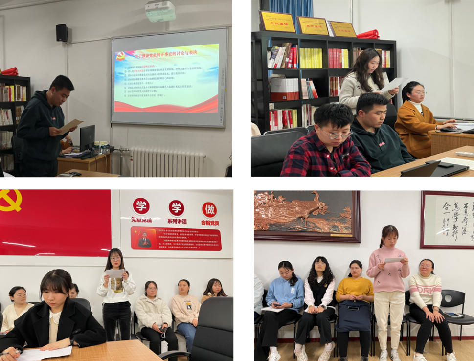 会议第一项:对预备党员裴玮同志转正的讨论和表决。大会上,裴玮同志宣读了转正申请,对其预备期一年内工作、生活、思想、学习等情况进行汇报并表明态度,其入党介绍人分别介绍该同志主要情况,并对其能否转正表明意见。付丽同志也对该同志其他方面的表现做了补充,与会党员进行充分讨论后进行无记名投票表决,一致同意裴玮同志按期转为正式党员。