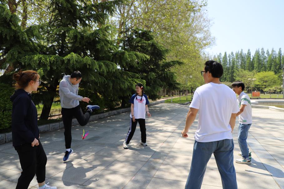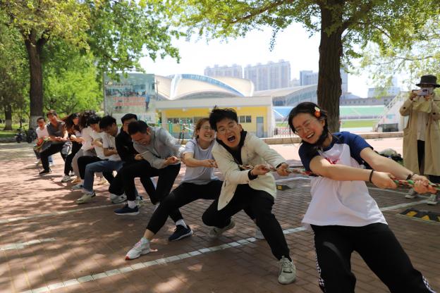 每位参数队员的腿上各系上三个气球,在五分钟之内互相踩对面小组的气球。剩余气球数量多的队伍获胜。同学们默契配合,场下观众加油助威,现场其乐融融。