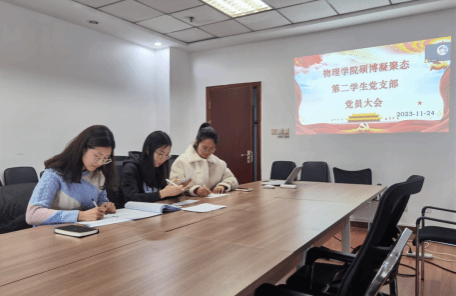为进一步加强基层党组织建设,不断壮大党员队伍,为党组织注入新鲜血液,增强基层党组织的创造力、凝聚力和战斗力,硕博凝聚态第二学生党支部于2023年11月24日中午12时30分在科技园C座510会议室采取线上与线下相结合的方式召开了支部党员大会。本次会议主要内容为发展对象杨佳姝同志转为预备党员的表决与讨论以及党支部换届选举工作,本次会议由支委杨秋萍同志主持。