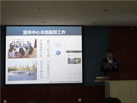 为表彰先进、树立典型、促进工作,进一步营造创先争优的浓厚氛围,不断增强基层团委组织的吸引力、凝聚力和战斗力,1月6日下午,物理与光电工程学院2014年度“两优一先”评选活动于物理系楼322成功举办。物理与光电工程学院党委副书记兼副院长杨木老师,学生工作办公室主任、2011级队辅导员李一鸣老师,团委书记、2012级队辅导员佟西原老师,2013级队辅导员俞洲老师莅临现场并担当本次评选的评委。