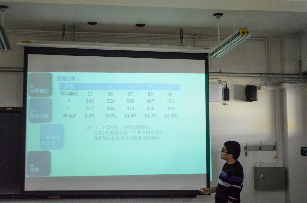 此次分赛共有17支队伍参加,第三轮分赛题目为“Resonating Glass”,本次比赛同学们就半满的酒杯会与扬声器发出的声音共振,研究相关参数是如何影响这个现象的展开答辩。到场参与评分的评委老师有校大学物理实验教学中心的滕永杰老师、白洪亮老师等。