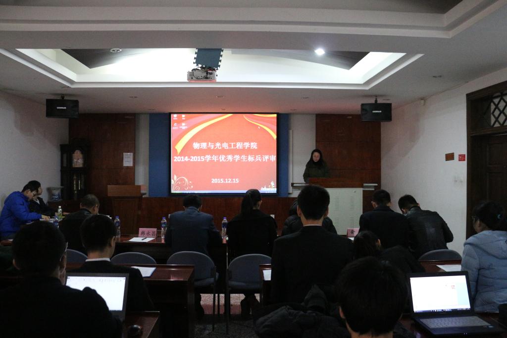 12月16日中午,物理与光电工程学院2014-2015学年优秀学生个人、集体标兵评选大会在系楼322举行。学院党委副书记兼副院长杨木老师,学院等离子方向教授、专业班主任王正汹老师,学生工作办公室主任、2011级队辅导员李一鸣老师,学院原子分子方向副教授、专业班主任韩永昌老师,团委书记、2012级辅导员佟西原老师,2013级辅导员俞州老师,2014级辅导员梁勇老师以及2015级辅导员纪丹红老师作为评委出席了本次大会,会议由纪丹红老师主持。