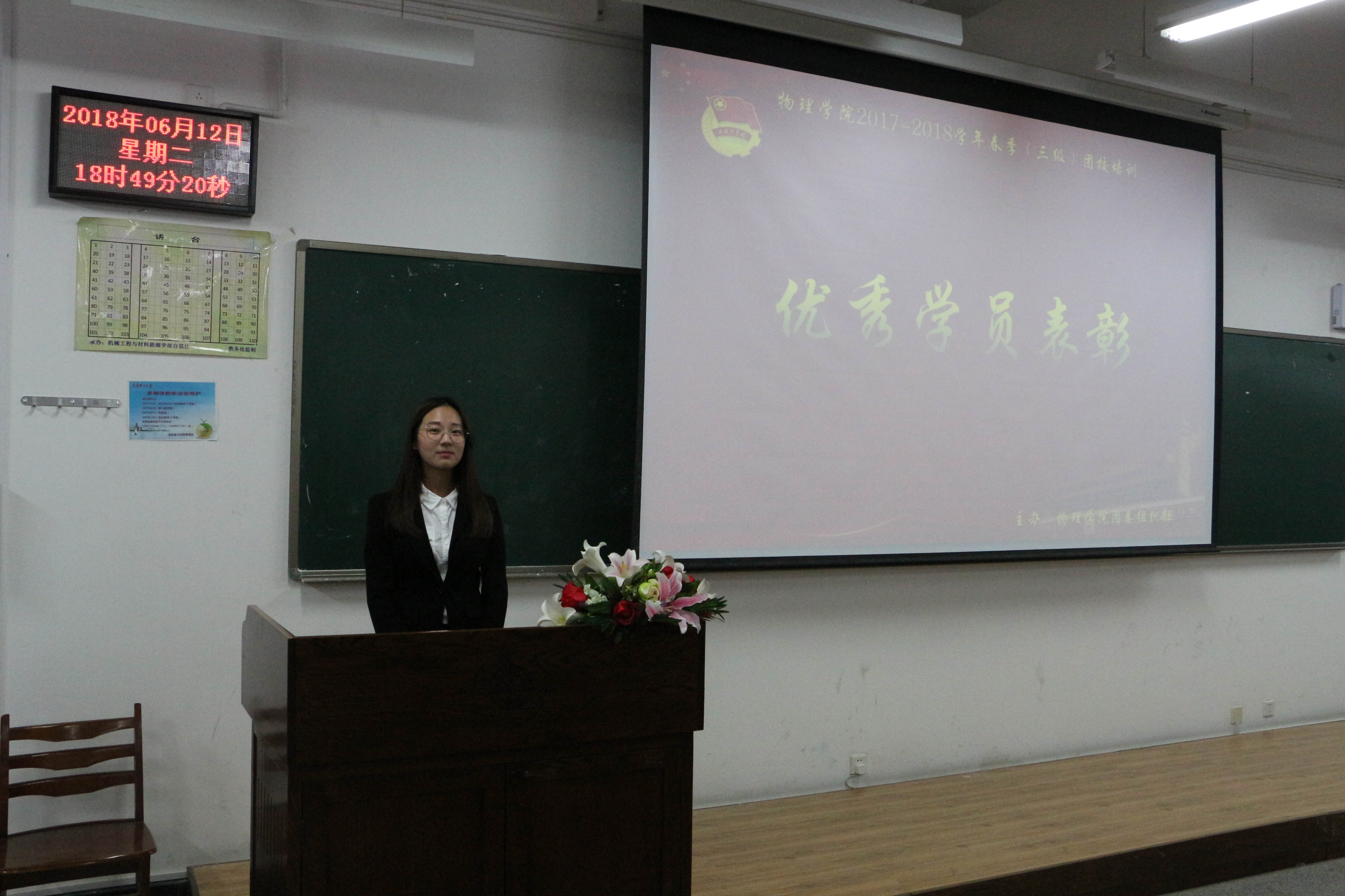 在表彰前,青年志愿者协会副部长张鹏进行本年度青年志愿者协会的工作总结,用精彩的汇报让同学们对青协的工作有着更深的了解。之后由学生会主席兼团委副书记董新宇为孟令刚、冯子泰等16名优秀青年志愿者颁奖,现场同学们也用热烈的掌声为他们祝贺。紧接着进行宝威体育平台2017~2018学年团校培训结业典礼暨优秀学员颁奖大会。本学年获得优秀学员称号的有祝明通、戴凡超等25名同学,并由团委常务副书记李睿意为获奖同学们颁奖。至此,本学期最后一次团校也在掌声中正式落下帷幕。
