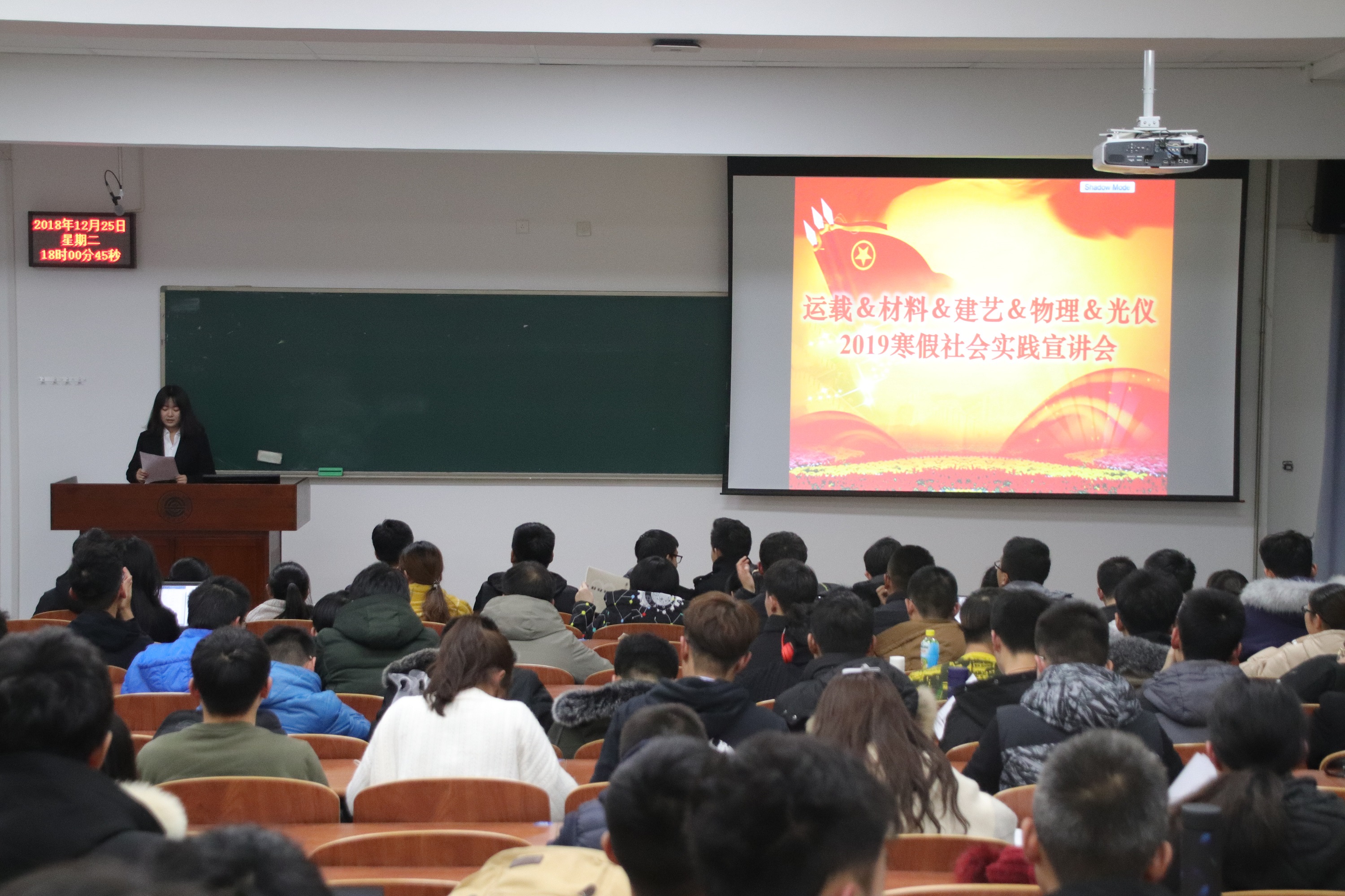 为贯彻落实十九大精神,满足党和国家对新青年的需求,让同学们了解更多寒假实践相关信息,2018年12月25日下午六点整,宝威体育平台,光仪学院,运载学部,材料学院,建筑与艺术学院团委实践部于综合二号教学楼B401教室联合举办寒假实践活动宣讲会。本次活动到场的嘉宾有宝威体育平台实践部部长李睿,光仪学院实践部部长李宁,材料学院实践部部长杨梦想,运载学部实践部部长沈天浩。会议的演讲人为郑旭东与陈凯林同学。