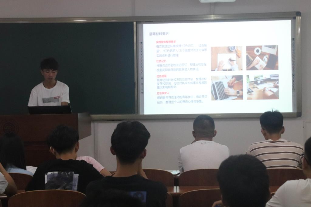 此次培训会主要针对暑期寻访老校友实践活动的程序和注意事项进行讲解和展开。首先由运载工程与力学学部实践部部长李鹏飞讲述寻访老校友暑假实践活动中后期材料准备的注意事项。其后,光电工程与仪器科学学院实践部部长于洋讲述投递新闻时优先选择的新闻媒体和新闻的写法以及写新闻时所需注意的真实性、公开性、实效性。最后,经济管理学院实践部部长陈润之解读寻访老校友专项实践文件并概述实践过程中的注意事项,如联系老校友的方式、时间选择、说话方式以及拍照技巧。