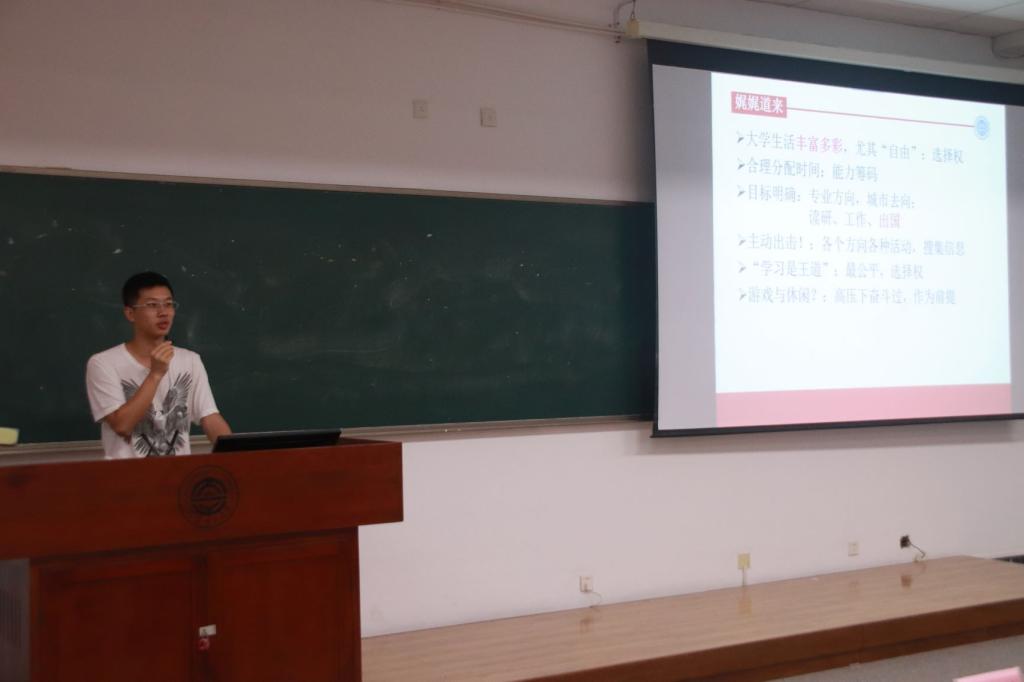 之后2016级何显龙分享自身经历并给予新生学习生活的建议,从时间分配、奖学金、未来规划、主动搜集信息的意义、学习的重要性、对游戏的看法7个方面分享经验。他提出成绩是最公平的评价标准,并建议同学在大一找到学习方法、大二注重专业课参加科创竞赛、大三科研实践训练、大四确定未来方向。