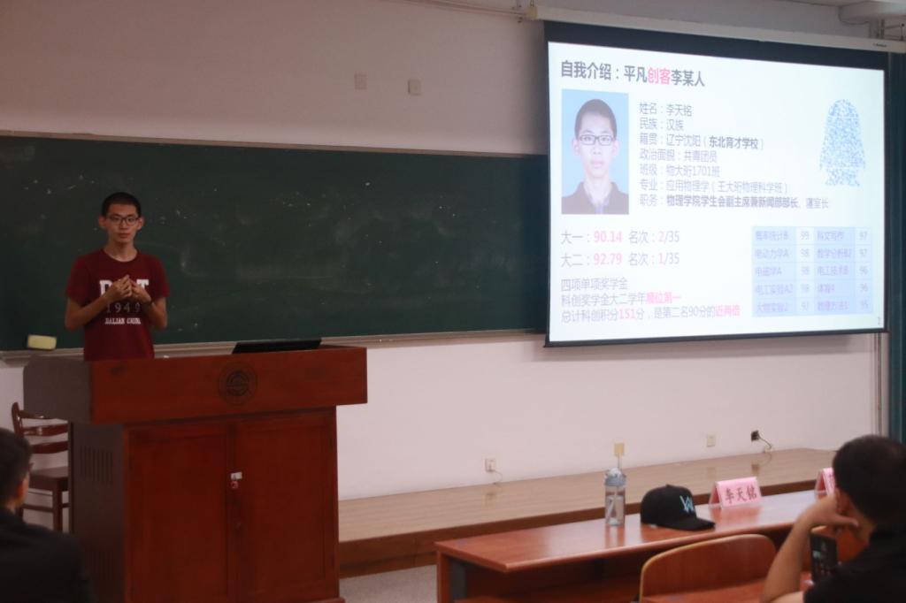 首先由2017级李天铭讲解创新创业学院。主要内容为创新创业学院的班级介绍与竞赛介绍,班级介绍包括ACM班、机电实践班、智能车智能硬件班等,竞赛方面则主要介绍互联网+大赛与物理学术竞赛,并强调科创并不应以奖学金为目的而是重在学习新知识。