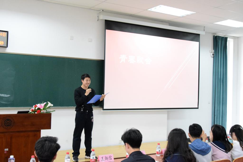在热烈的掌声中,歌会拉开了序幕。主持人李雨萌同学宣读开场白及评审规则。歌会的评分以“评委为主,全体观众参与打分”为原则,按不同权重计算评委与观众总票数作为选手的最终成绩。第一个节目是由齐含含同学带来的歌曲《新贵妃醉酒》,嘹亮的嗓音立刻点燃了歌会的第一个小高潮。此后各位同学登台献艺,各展歌喉,歌会的气氛愈发热烈,掌声和喝彩声一浪高过一浪。期间,穿插于竞演之中的知识竞赛,舒缓了竞演紧张的气氛,让歌会现场处处充满欢声笑语。