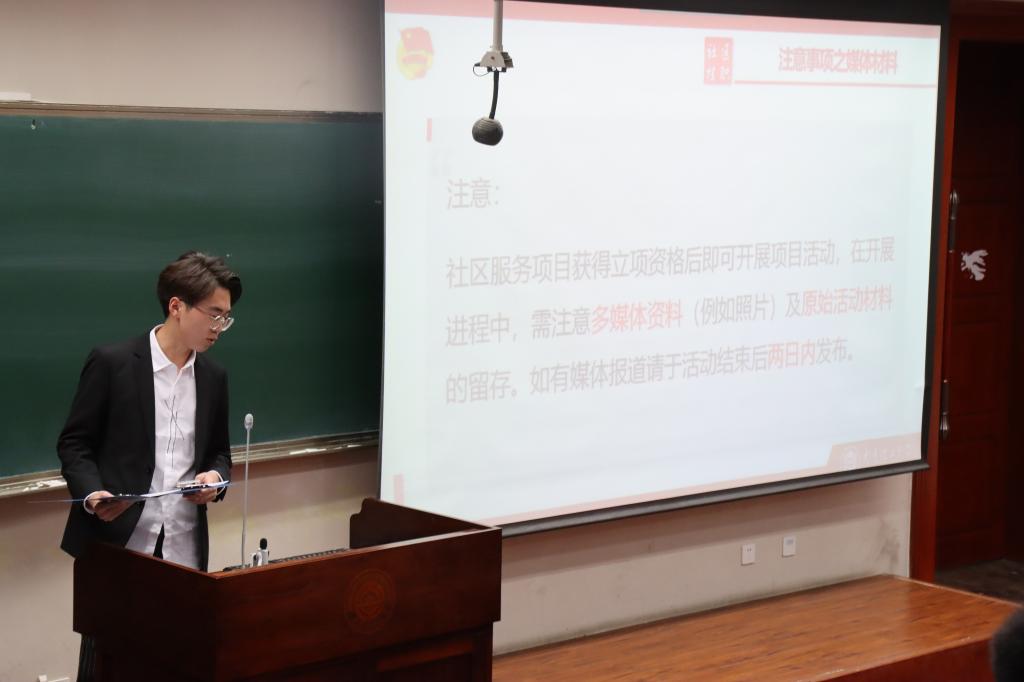 首先由经济管理学院社区挂职部的周俊儒同学介绍社区挂职工作主要的工作项目和内容。他希望此次社区挂职工作者能够积极调研社区、走入社区、深入社区并协助社区工作人员组织团建活动和开展党建活动。周俊儒也对管理与审核的办法进行讲解,主要对周记制度及精品周记挑选制度进行说明,强调对上交优秀周记的挂职工作者将结于一定奖励,对失真、虚假等周记主人不予结业处罚。最后周俊儒简要介绍此次社区挂职工作优秀评比制度。参与社区服务项目的社区挂职工作者将有机会获得‘校社区挂职优秀个人’‘校社区挂职锻炼标兵’荣誉称号。