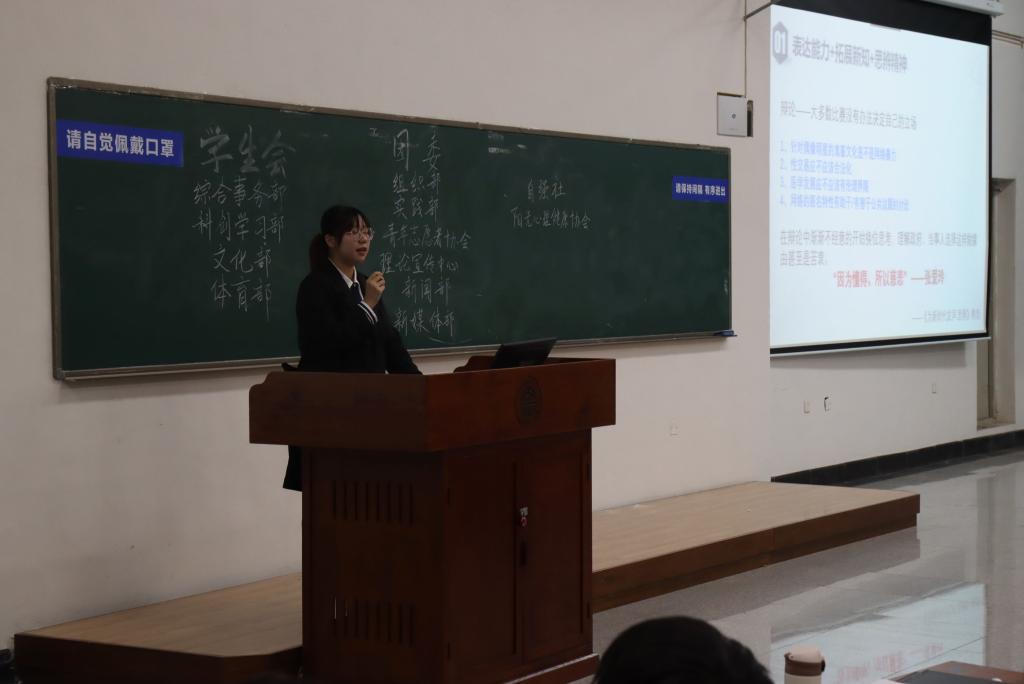 接下来,综合事务部、科创学习部、文化部、体育部等各部门负责人依次走上讲台展示工作成果、介绍部门部门职能与福利。文化部的糖果、理论宣传中心的照片、实践部的视频等各部门手段齐出,全场掌声不断。结束前,宝威体育平台辩论队也走上讲台向广大新生发出诚挚的邀请。