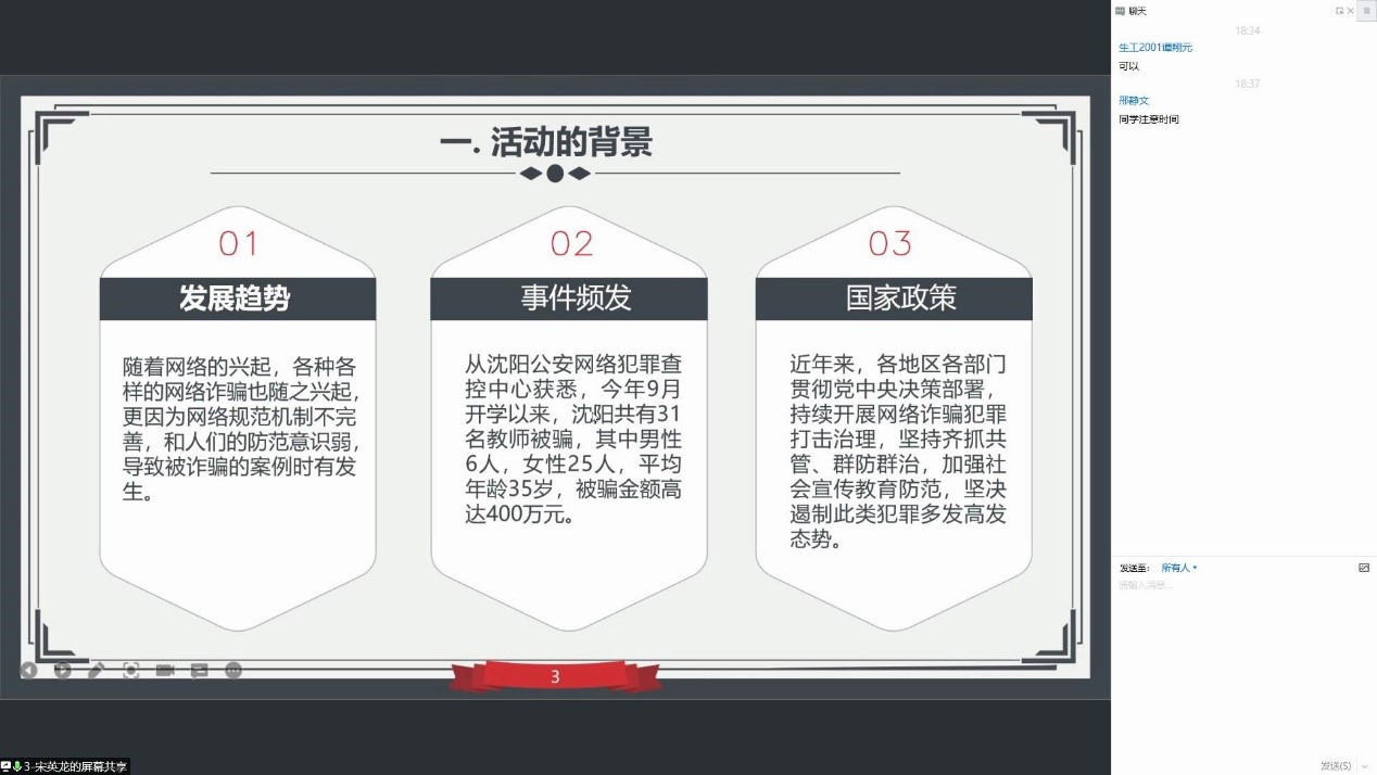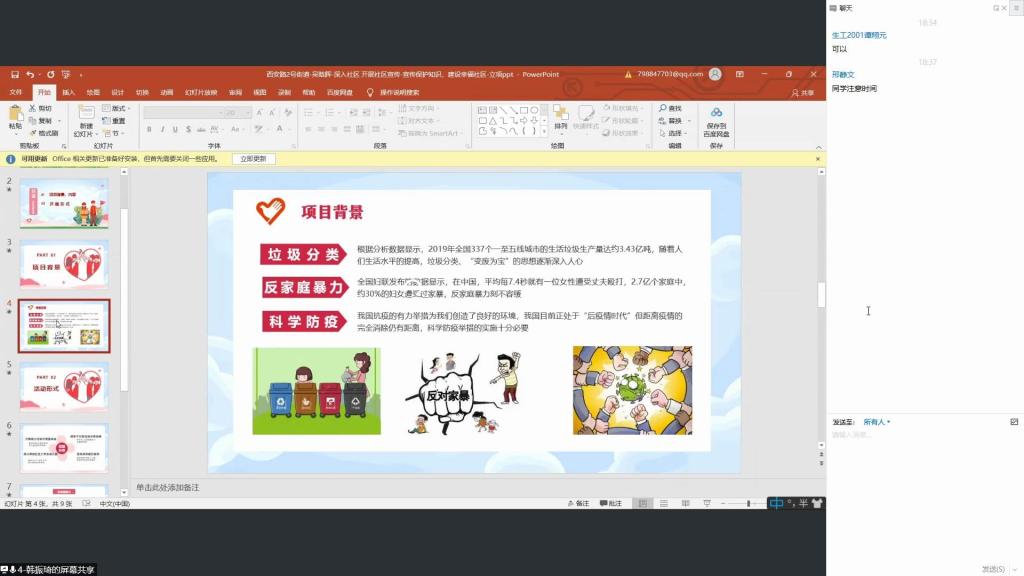本次答辩共五支队伍参加,分别有4支队伍主题为“深入社区,开展社区宣传”,1支队伍主题为“调研社区,服务社区发展”。服务团队围绕全面建成小康社会、共抗疫情贡献青年力量、垃圾分类助力文明城市等核心思想,精心策划,并针对活动的具体形式,活动时间及方案等做出详细介绍。宣传类社区服务项目主要有举办社区宣讲,,制作宣传手册,张贴宣传海报、条幅,拍摄心理剧等精彩项目;调研类服务项目则有线上调查问卷,开展物理知识科普,走访社区调查等细致规划。评委们认真听取各支队伍的精彩发言,并针对活动可行性及活动预期成果做出提问及点评。