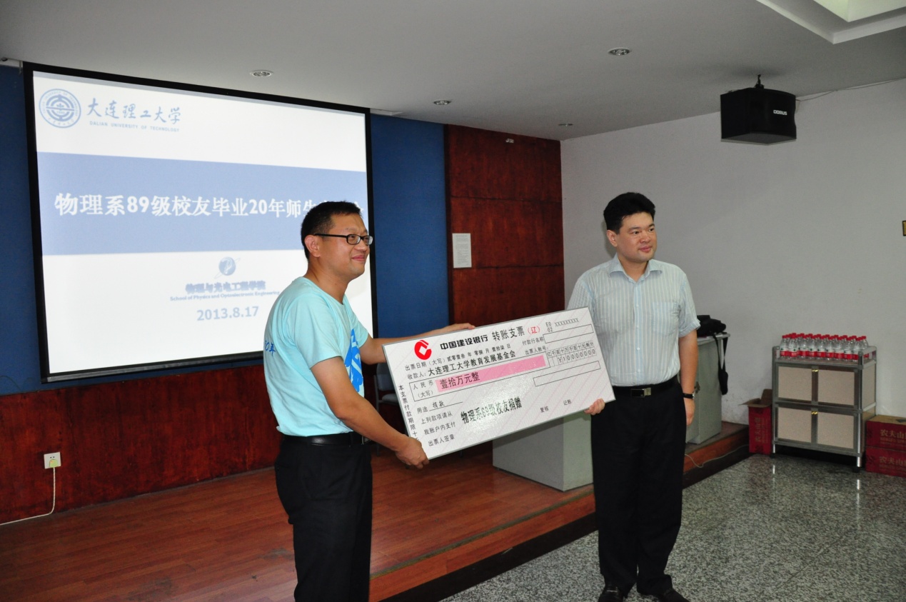 恳谈会由89级1班曾经的团支部书记解春禹主持,作为开场白,老支书与老班长共同发表了热情洋溢、声情并茂的返校感言。物理与光电工程学院院长赵明山教授代表全院师生对89级校友重返母校表示热烈欢迎,并向校友详细地介绍了学院和母校20年来取得的成绩。会上,现任北京创意博科技能源有限公司董事长的原班长邹怀松作为校友代表发言,对学校和学院的培养以及对本次返校活动的大力支持表示由衷感谢;同时,他宣布由物理89级全体校友共同设立了“物理89级校友基金”,主要面向物理与光电工程学院的优秀学生标兵设立专项奖学金,并对学院的物理嘉年华文化品牌活动予以支持,本次捐赠金额10万元。会上,翟刚军老师代表大连理工大学教育发展基金会接受了校友的捐助。