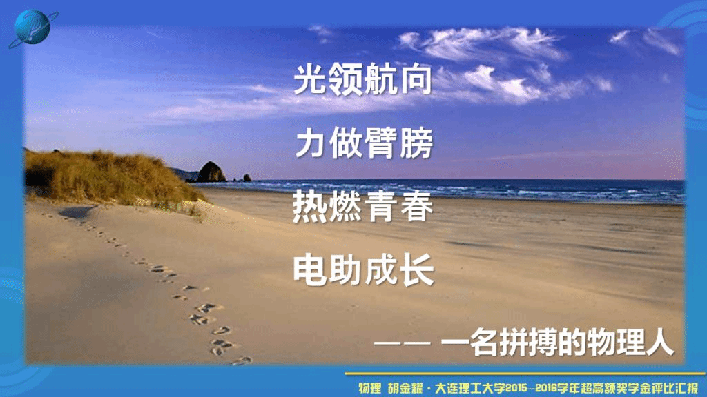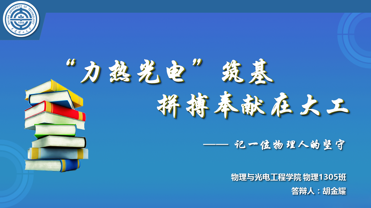 我是宝威体育平台2013级光电信息科学与工程专业的胡金耀。很荣幸参与高额奖学金答辩。我汇报的主题是“力热光电”筑基,拼搏奉献在大工。今天,我以一名物理人的身份,汇报我的大学故事。
