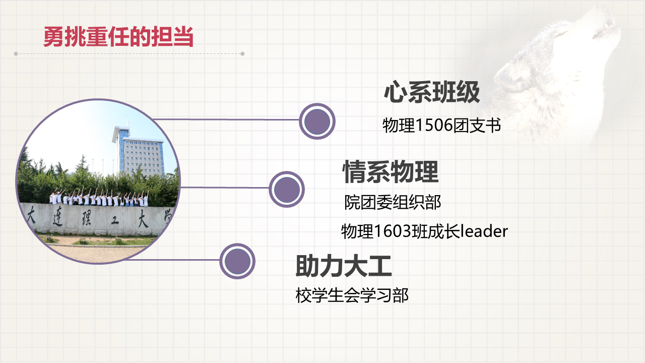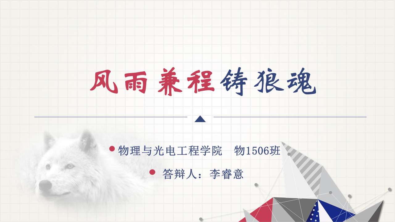 我是来自物理与光电工程学院1506班的李睿意。很荣幸能参与本次答辩。接下来,我将以《风雨兼程铸狼魂》为题,开始我的汇报。