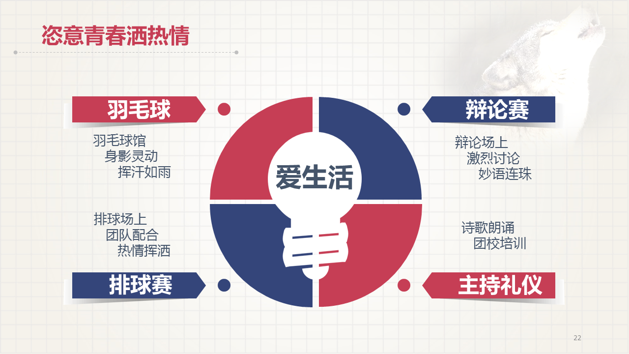 5次实践,4次队长,3次校部评比,让她看到更广阔的风景。羽毛球,排球,辩论赛,主持,也有些不期的收获,校排球赛“季军”,院辩论赛“二等奖”,心理剧“二等奖”,恣意青春,绽放活力。
