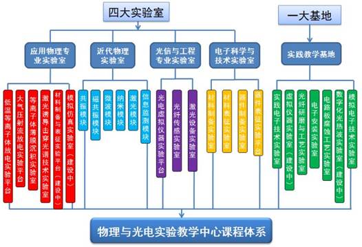随着物理系的学科发展,中心逐步形成了以等离子体物理国家重点学科为主的物理学一级学科群,专业实验教学内容越来越多,覆盖范围越来越大。为了适应应用物理专业实践教学厚基础、宽口径的培养要求,2007年,中心整合了应用物理专业实验室、近代物理实验室、光电信息科学与工程专业实验室、电子科学与技术专业实验室以及实践教学基地五大实验室(图1所示)。其中,应用物理专业实验室依托等离子体物理学国家重点学科和三束材料改性教育部重点实验室的科研力量和设备基础而建,成为应用物理学专业培养的主要实践教学基地。应用物理专业实验室由等离子体物理、理论物理、凝聚态物理、原子与分子物理、光学等重点学科支撑。教学和科研相结合,融知识传授与能力培养为一体,旨在培养具有良好的数理基础、掌握物理学的基础理论、基本知识和基本技能,具有广泛的科学适应能力及知识更新能力的厚基础、宽口径、复合型、创新型优秀人才,及从事科学研究、产品设计与研发、技术开发与管理等工作的理工结合型高级专门人才。电子科学与技术实验旨在培养具备微电子、光电子、集成电路等领域宽厚理论基础、实验能力和专业知识,能在电子科学与技术及相关领域从事各种电子材料、元器件、集成电路、电子系统、光电子系统的设计、制造、科技开发,以及科学研究、教学和生产管理工作的复合型专业人才。光电信息科学与工程专业实验更注重工程技术研究和服务社会的应用研究,在培养光电信息技术领域高层次人才的同时,能够发挥学科在光电传感和测量以及光通信技术研究方面的优势,致力于将科研成果转化为推动企业技术进步和国防事业的技术产品。整合之后的物理与光电实验教学中心,教学理念先进、教学目标明确、教学内容全面、实验装备精良、教学功能完备、队伍结构合理、教学效果突出,已成为现代化、开放式、极具特色的实验教学中心。